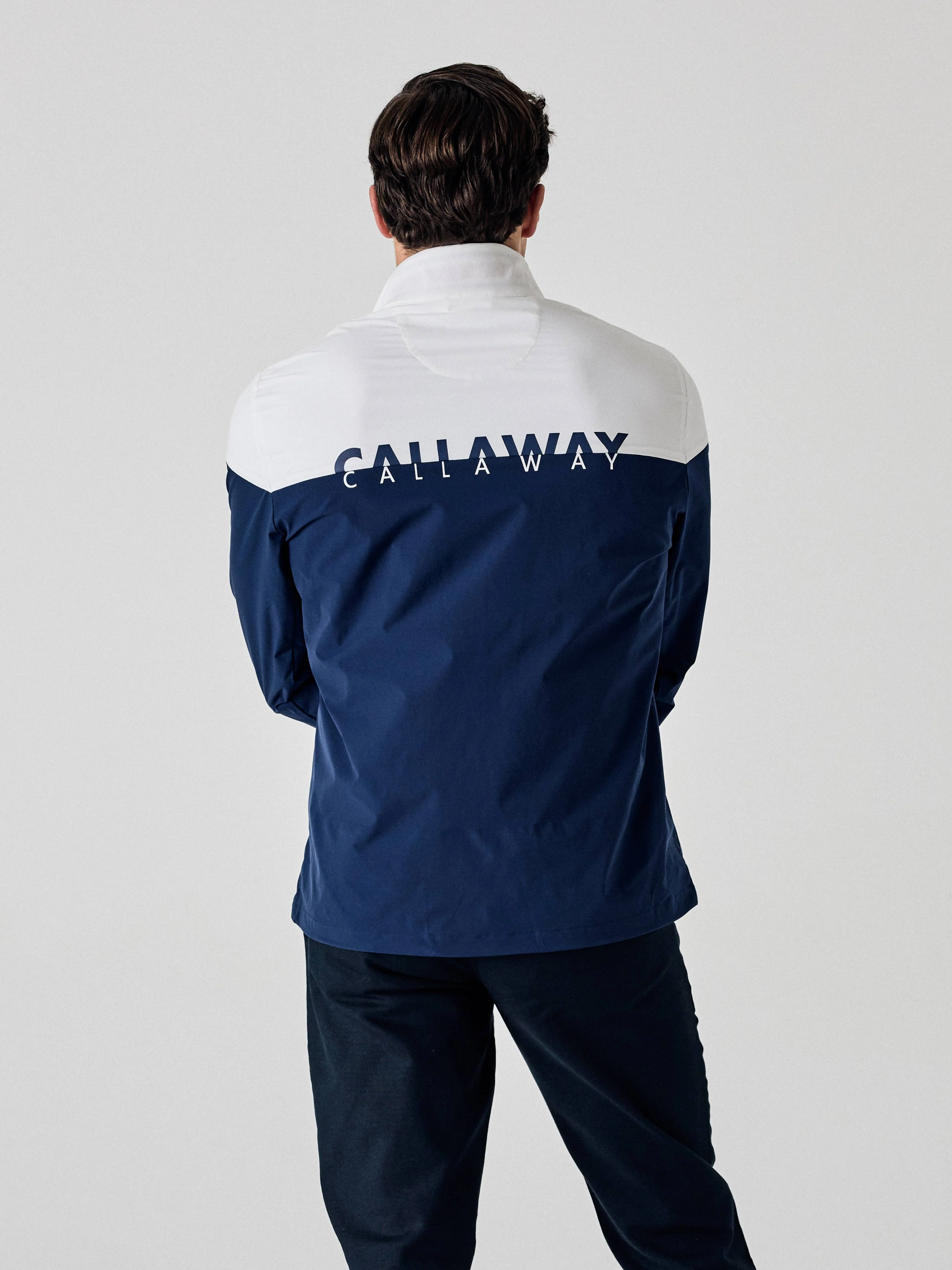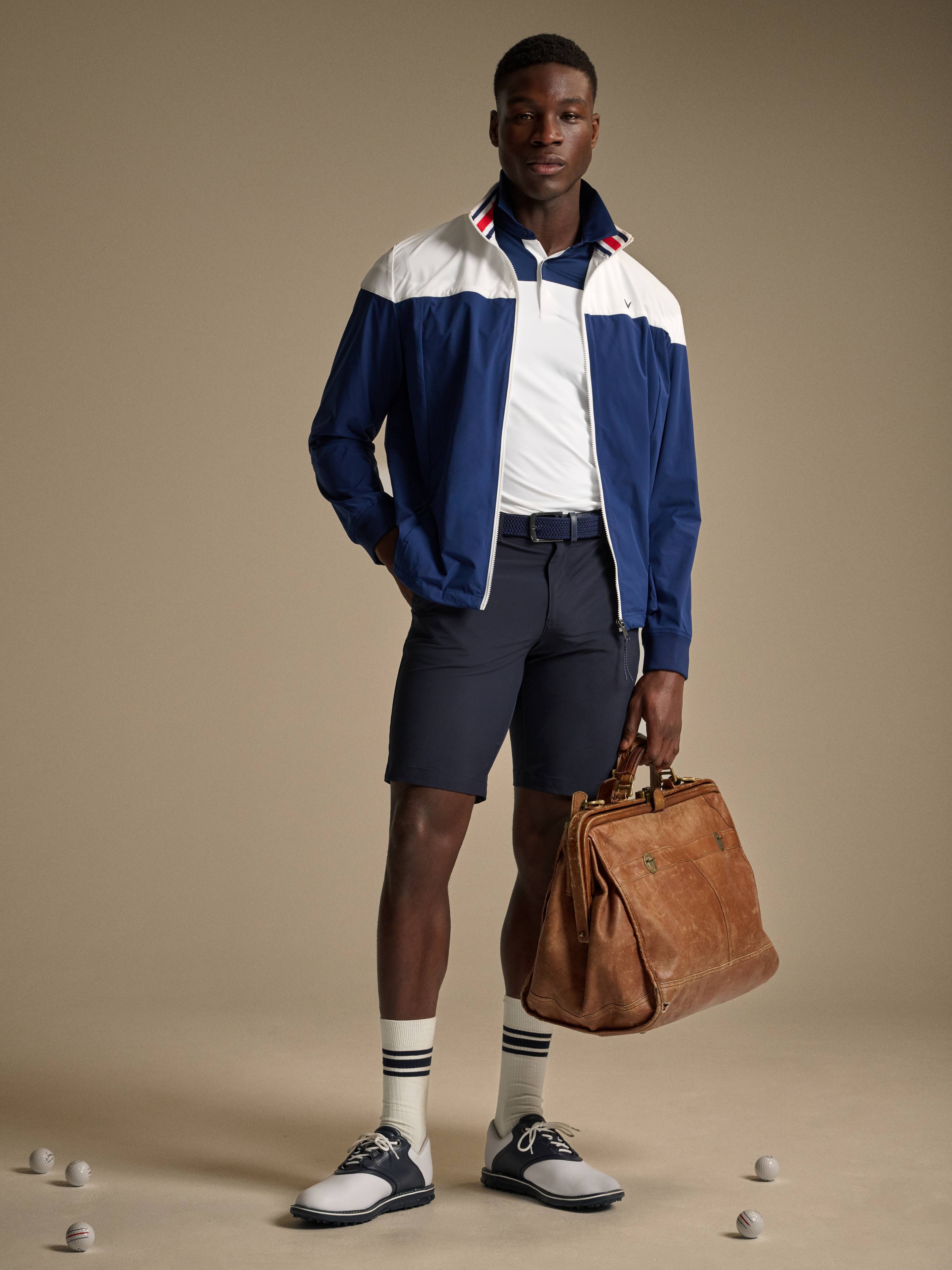 Featuring bold color blocking, this men’s golf jacket from the Callaway Legacy Collection™ will be a comfortable and stylish addition to your athletic apparel. The full-zip jacket is made from durable plain weave fabric, so you can count on it to last through season after season of regular wear. It features zippered pockets at the front to keep small items secure as you move around the course, while a high mock collar helps to protect your neck from the sun, wind and rain. Overlapping logos printed on the back and a chevron logo at the front chest add some extra athletic flair to the design.