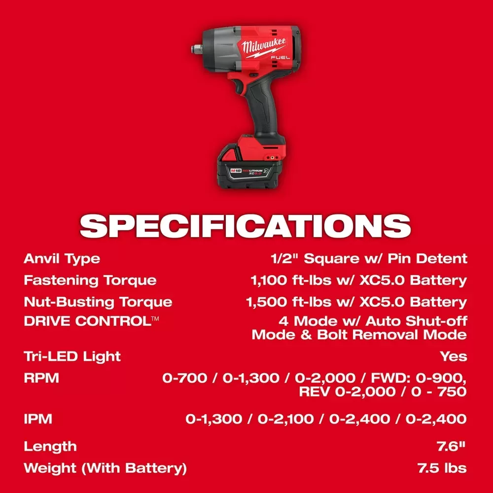 • POWERSTATE Brushless Motor delivers up to 1,100 ft-lbs of Fastening Torque & 1,500 ft-lbs of Nut-Busting Torque w/ M18 REDLITHIUM XC5.0 Battery
