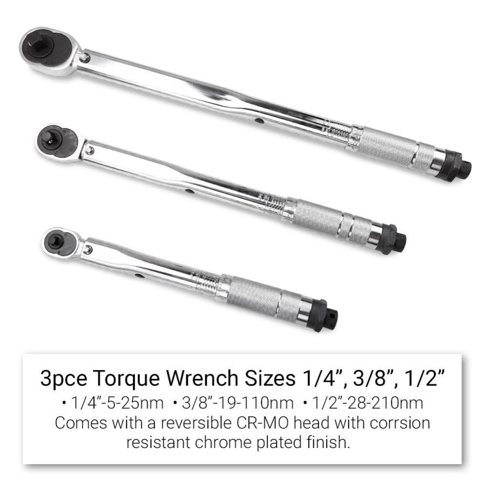 - 3pce Torque Wrench: 1/4", 3/8" & 1/2"
