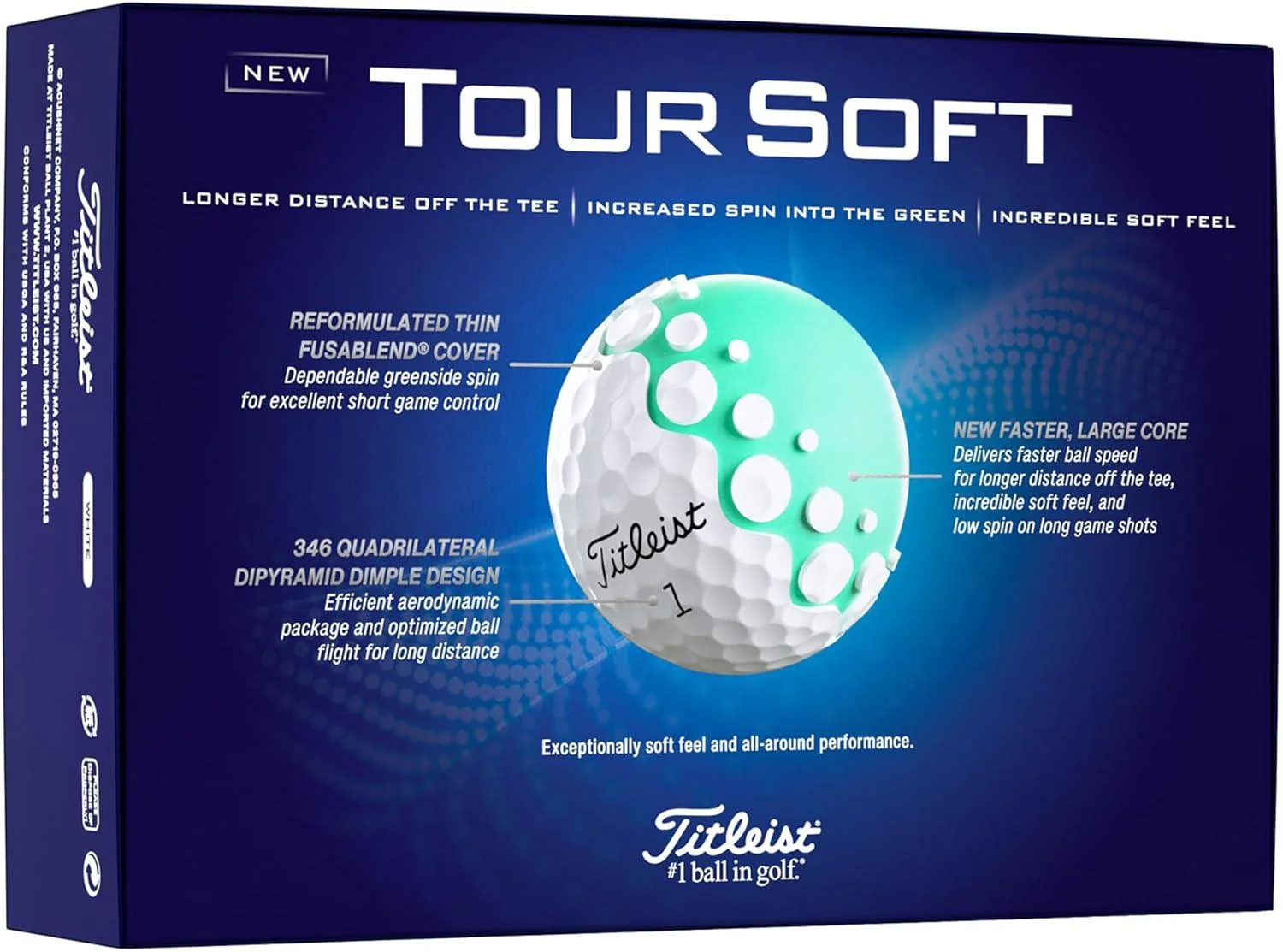 The new Titleist Tour Soft golf ball is engineered to perform tee-to-green. Featuring a large, fast core for exceptionally soft feel and a new, more efficient aerodynamic package that will help you experience longer distance off the tee.