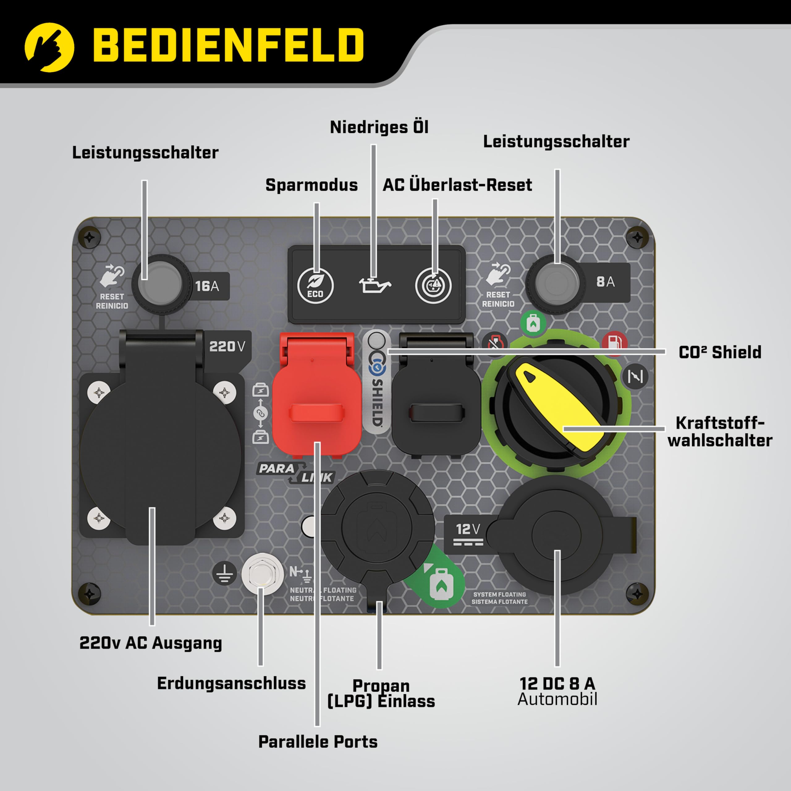 CO Shield technology monitors the accumulation of carbon monoxide (CO), a toxic gas produced by the engine when the generator is in operation. When CO Shield detects a high CO content, it automatically switches off the engine.