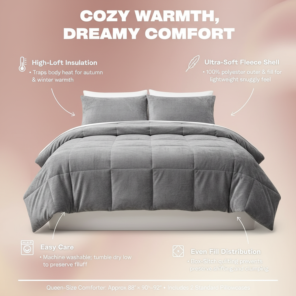 Indulge in the unmatched comfort of our fluffy comforter set crafted from premium fleece 🧸. Its plush texture offers a cozy, warm embrace, while the exceptional insulation keeps you snug through the coldest nights ❄️, letting you drift into dreamland surrounded by soothing softness.